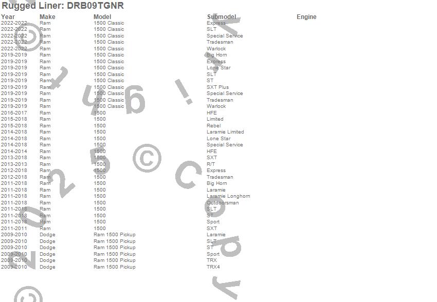 Rugged Liner - Rugged Liner Tailgate Liner P/N DRB09TGNR Features: